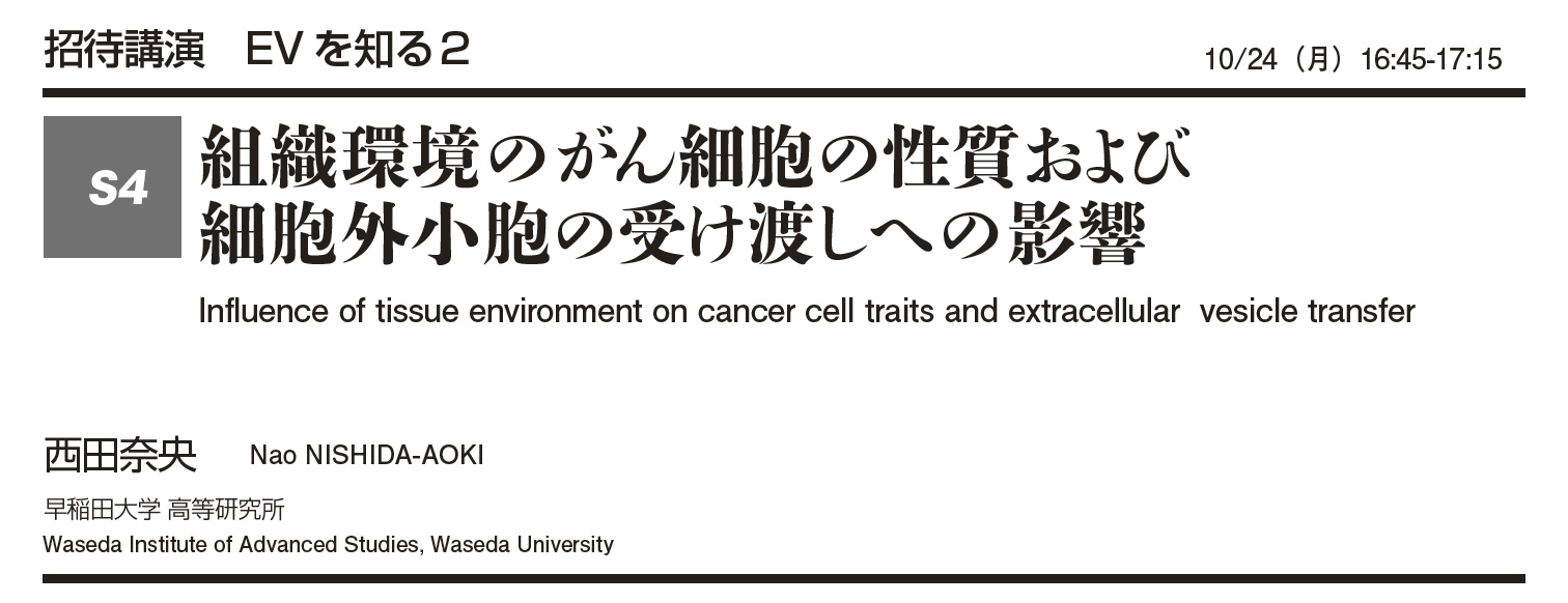 第9回日本細胞外小胞学会初日(10月24日)のセッション2【EVを知る2】の招待講演(16:45-17:15)では、早稲田大学 高等研究所 (Waseda Institute of Advanced Studies, Waseda University)の西田奈央 (Nao NISHIDA-AOKI) 先生に『組織環境のがん細胞の性質および細胞外小胞の受け渡しへの影響 (Influence of tissue environment on cancer cell traits and extracellular vesicle transfer)』と題してお話しをしていただきます。