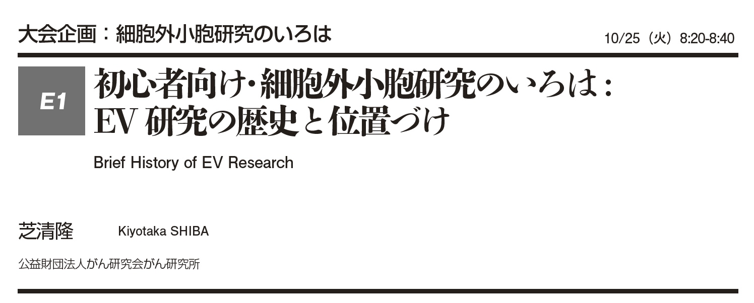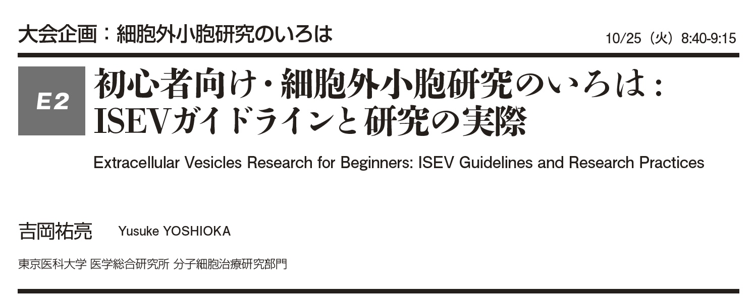 第9回日本細胞外小胞学会2日目(10月25日)の朝早くに、大会企画『細胞外小胞研究のいろは』として「これからEV研究を始めようか」といった人達向けの入門セミナーをおこないます。大会長芝清隆(Kiyotaka SHIBA)による『EV 研究の歴史と位置づけ(Brief History of EV Research)』(8:20-8:40)に続き、東京医科大学 医学総合研究所 分子細胞治療研究部門の吉岡祐亮(Yusuke YOSHIOKA)先生による『ISEVガイドラインと研究の実際(Extracellular Vesicles Research for Beginners: ISEV Guidelines and Research Practices)』(8:40-9:15)があります。若い方のご参加・質問をお待ちしております。