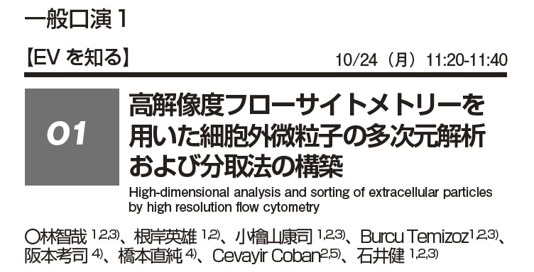 第9回日本細胞外小胞学会初日(10月24日)のセッション1【EVを知る1】の一般口演1(11:20-11:40)では、東京大学医科学研究所、医薬基盤・健康・栄養研究所 (IMSUT, CVAR)の林智哉 (Tomoya HAYASHI) 先生に『高解像度フローサイトメトリーを用いた細胞外微粒子の多次元解析および分取法の構築 (High-dimensional analysis and sorting of extracellular particles by high resolution flow cytometry)』と題して、細胞外小胞と膜構造を有しない微粒子の両方を解析・分取するフローサイトメトリーシステムについてお話しをしていただきます。