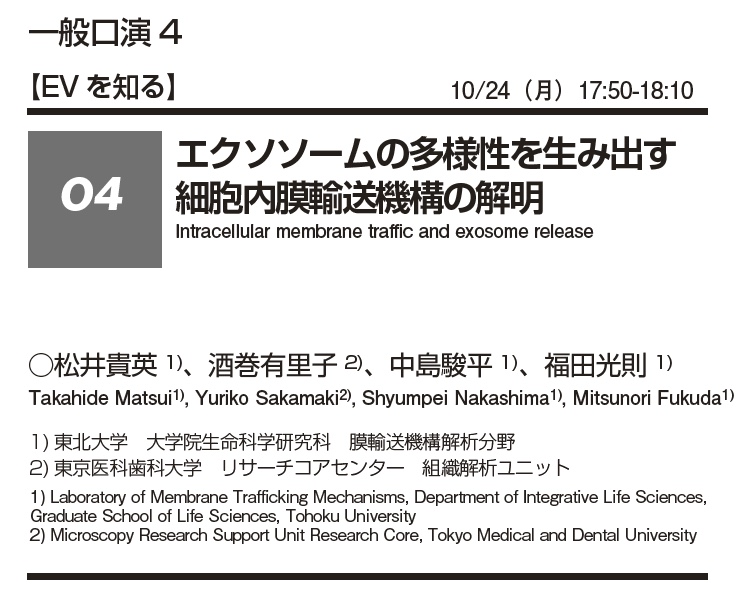 第9回日本細胞外小胞学会初日(10月24日)のセッション2【EVを知る2】の一般口演4(17:50-18:10)では、東北大学大学院生命科学研究科 膜輸送機構解析分野 (Laboratory of Membrane Trafficking Mechanisms, Department of Integrative Life Sciences, Graduate School of Life Sciences, Tohoku University)の松井貴英 (Takahide MATSUI) 先生に『エクソソームの多様性を生み出す細胞内膜輸送機構の解明 (Intracellular membrane traffic and exosome release)』と題して、上皮細胞の頂端と側底から異なる細胞外小胞が分泌される機構についてお話しをしていただきます。