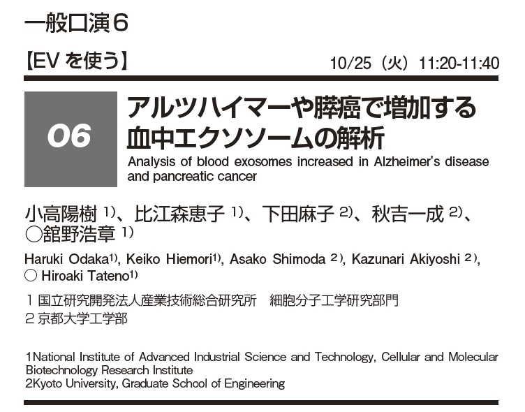 第9回日本細胞外小胞学会2日目(10月25日)のセッション3【EVを使う1】の一般口演6(11:20-11:40)では、産業技術総合研究所 細胞分子工学研究部門 (National Institute of Advanced Industrial Science and Technology, Cellular and Molecular Biotechnology Research Institute)の小高陽樹 (Haruki ODAKA) 先生に『アルツハイマーや膵癌で増加する血中エクソソームの解析 (Analysis of blood exosomes increased in Alzheimer's disease and pancreatic cancer)』と題して、細胞外小胞の糖鎖プロフィール情報を活用した血清中細胞外小胞診断についてお話しをしていただきます。